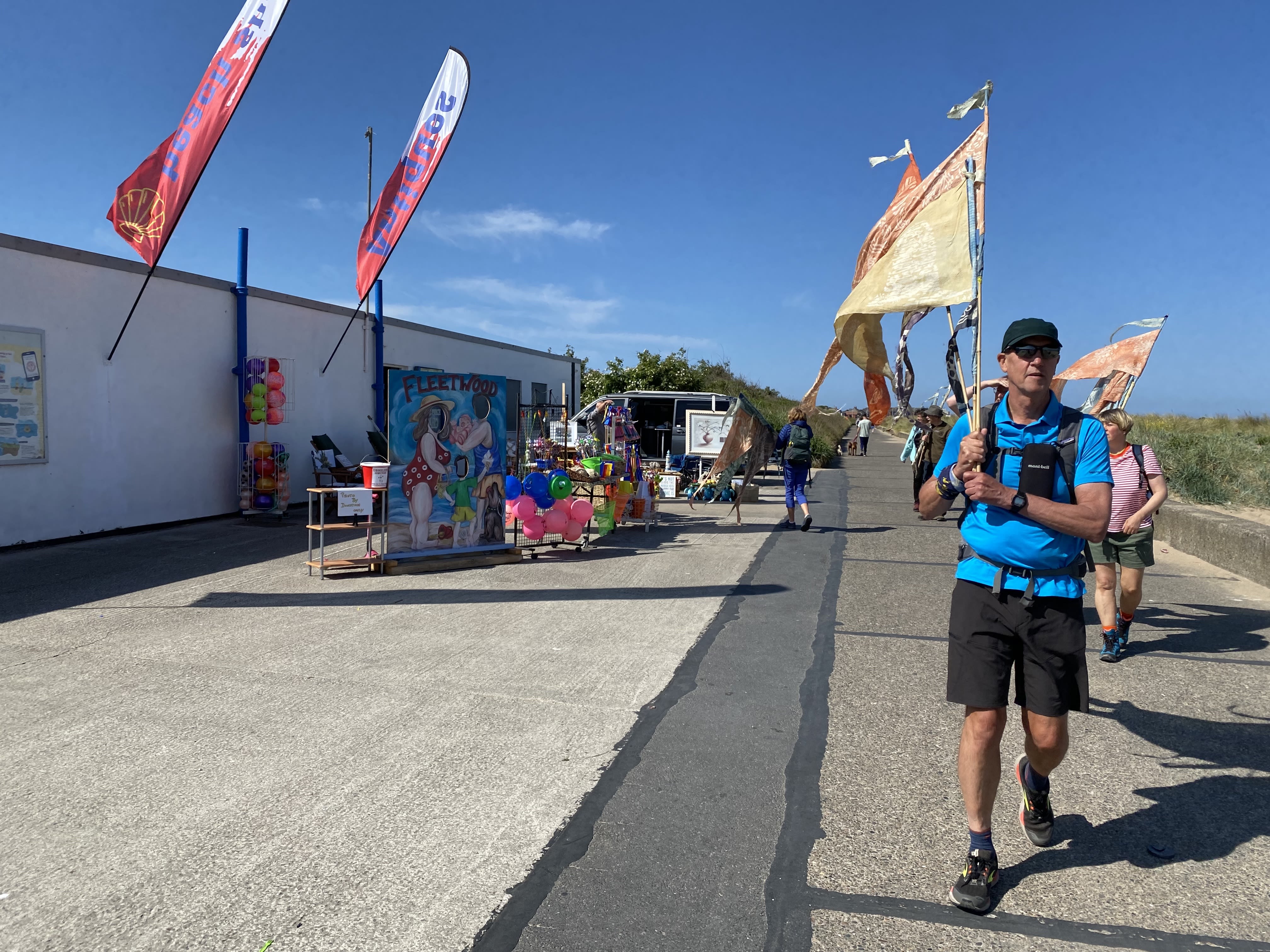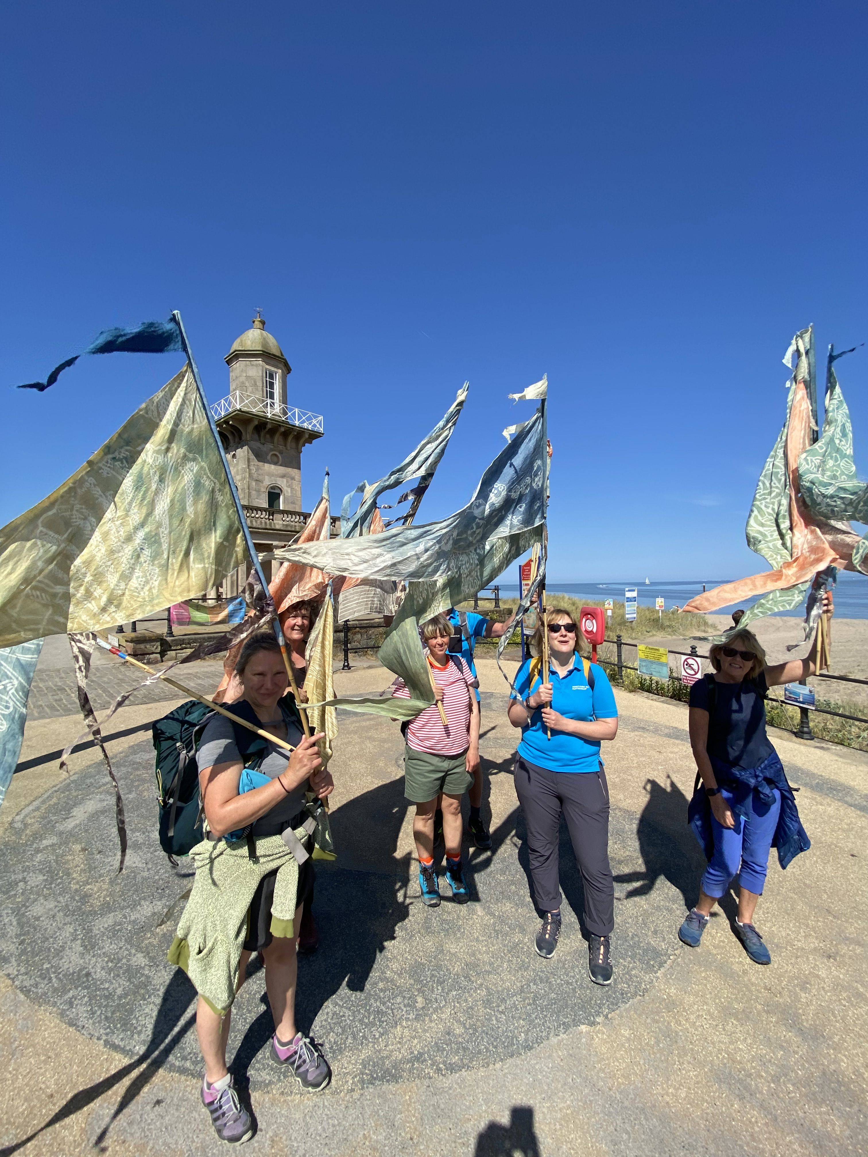 The Bay Lines - Beach of Dreams project maps 120 miles across Morecambe Bay. In June 2023 artists and walkers from the arts organisation Kinetika walked the whole route of 120 miles around Morecambe Bay carrying silk pennants representing miles of coastline. Their mission - to create 120 new silk pennants, one for each mile of the Bay, to be designed from the mile images and stories contributed by members of the public around the Bay and to be displayed as a coastal art installations at 4 locations across the Bay over August Bank Holiday weekend 2023. The project was commissioned by Ways Around the Bay from the Morecambe Bay Partnership.