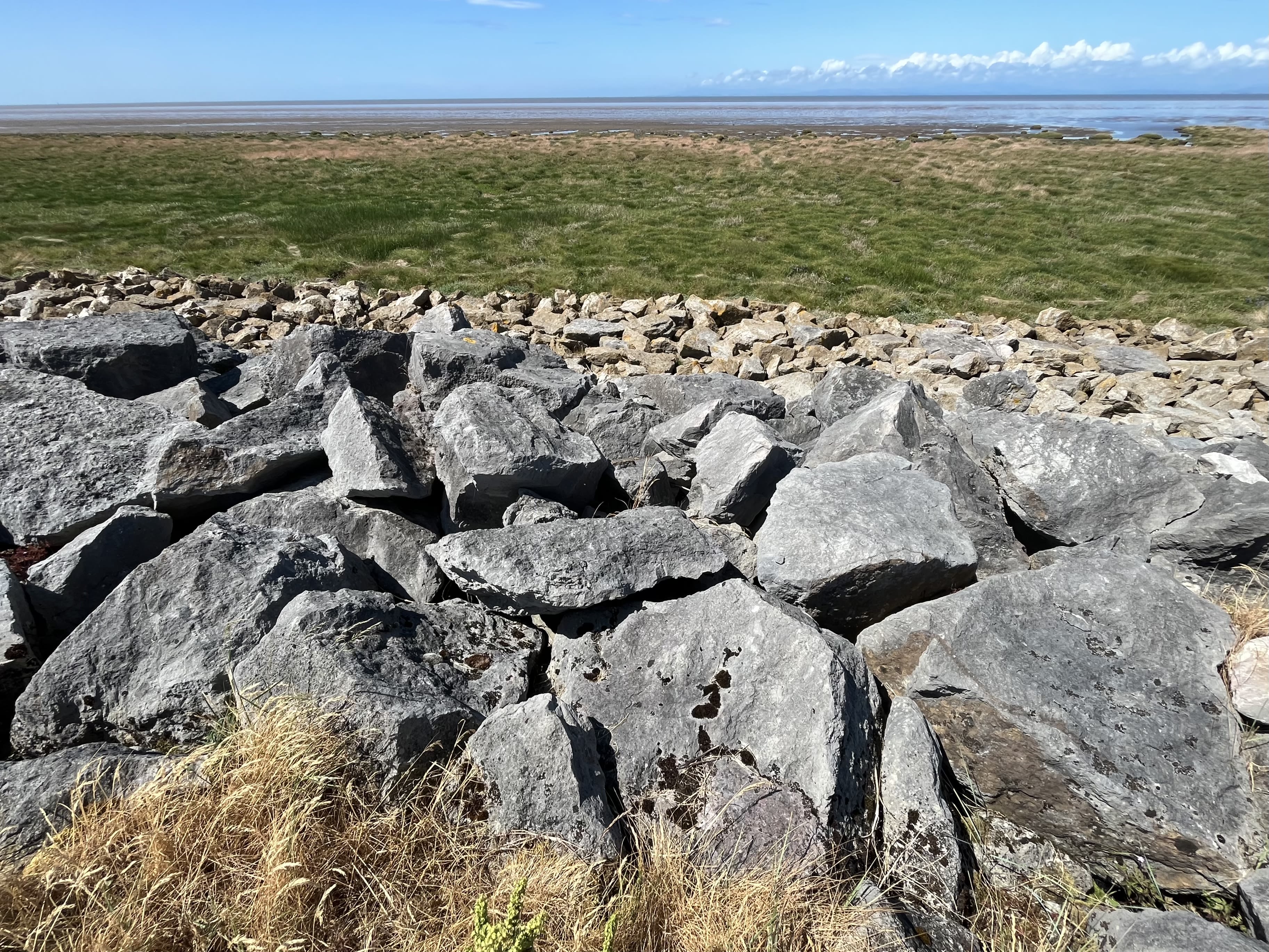 This mile of coastline follows along the top of a sea wall built from big, jumbled blocks. It is quite a straight section of path with grass verging and private gardens to one side and expansive views of the Lake District across Morecambe Bay to the other.